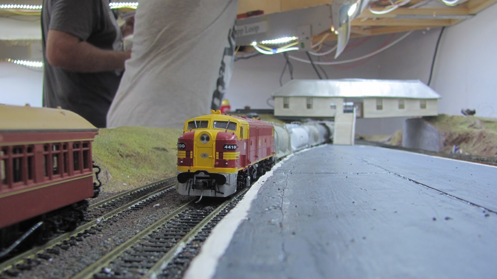Some more crew around Fairy Hill Loop and heading into Kyogle. I think this is when John lost his train (the Tamper) somewhere on the layout and he could not find it.